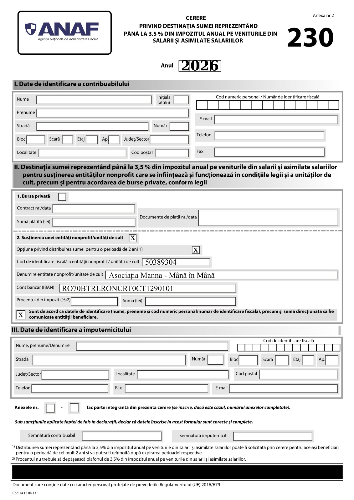Formularul este deja completat cu datele Asociației. Este pentru anul anterior, deoarece redirecționarea se aplică asupra impozitului pe venit deja plătit statului.